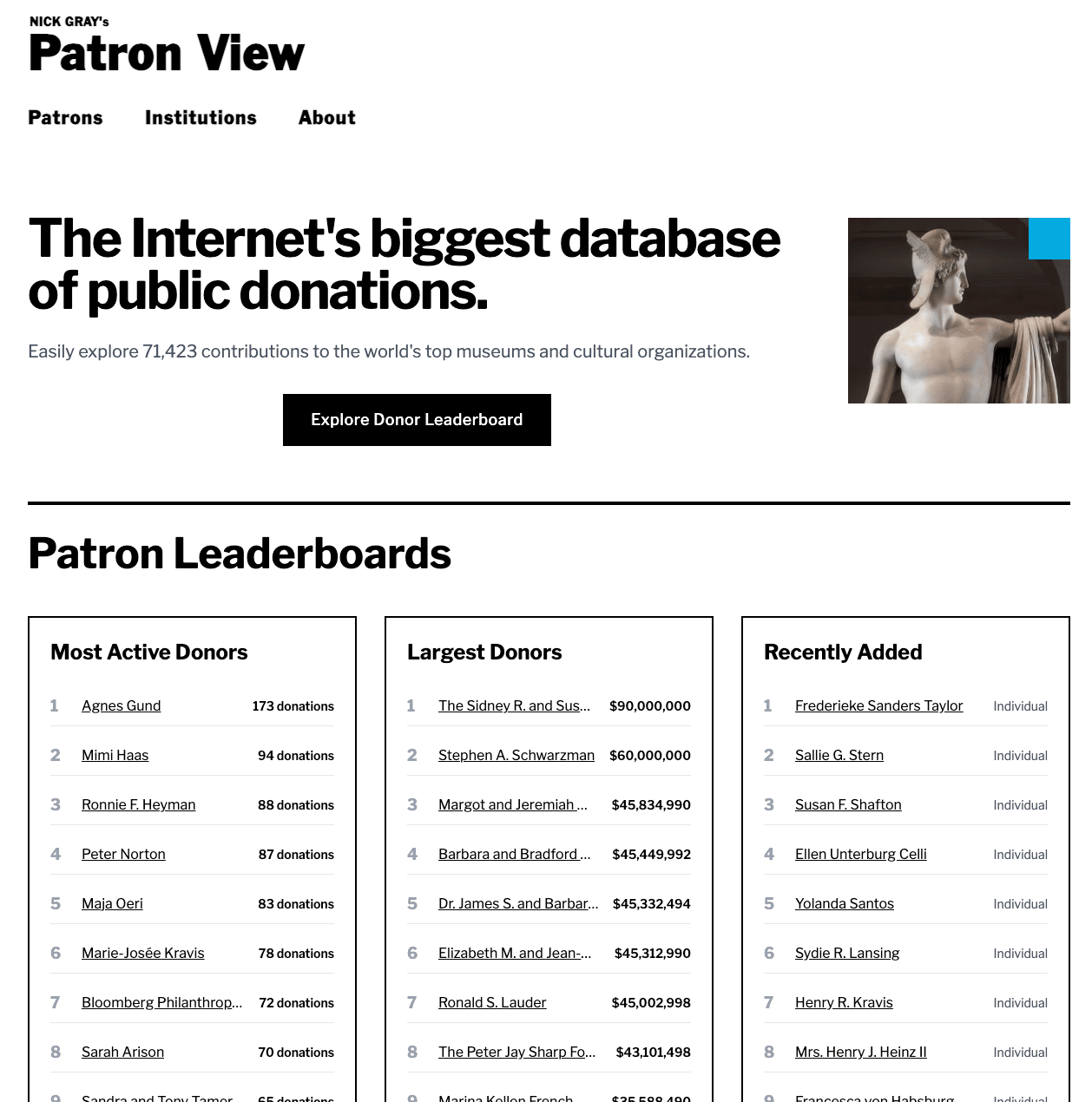 PatronView is an explorable database of donors to world class museums and institutions. It's indexed and categorized 300,000 donations and contributions to museums in New York City.